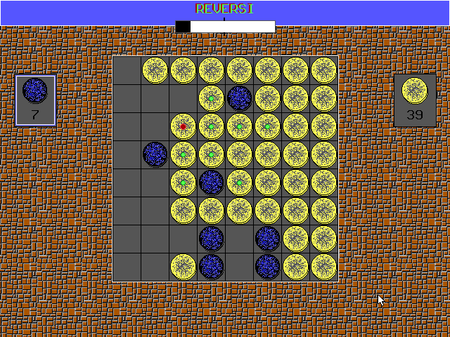В главном меню можно вспомнить или узнать правила игры, после чего самое время выбирать режим: против искусственного интеллекта или же против друга у компьютера рядом с вами. Во втором случае игроки делают ходы по очереди (управление с помощью мыши), а вот в первом придётся сразиться с весьма сильным соперником. Внешний вид Reversi можно назвать простым, но не примитивным: кирпичная текстура фона вокруг доски, фишки с объёмной рисовкой и серой пиксельной "присыпкой".