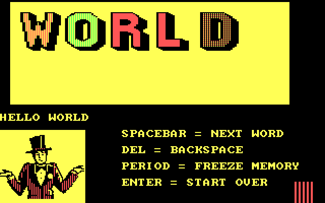 Наконец, «Marquee Maker» для разнообразия представляет собой свободную «песочницу»: мы всего лишь набираем на экране слова и буквы на своё собственное усмотрение. Левая стрелка, «Del» и «Backspace» одинаково отвечают за удаление последней прописанной литеры, «пробел» означает переход к следующему слову, «ввод» позволяет начать всё с чистого листа, ну а «точка» символизирует завершение набора нами своего сообщения миру, которое после этого начинает появляться на виртуальной доске слово за словом бесконечное количество раз. Никакой цели или сверхзадачи при этом, понятное дело, не предусмотрено.