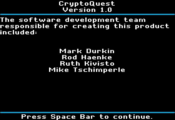 Разобравшись с шифрами, давайте посмотрим, что игра нам предлагает делать. В красивом (как минимум по меркам графики Apple II) главном меню есть несколько опций. Можно сразу заняться практикой в первом разделе, «Quest Training»: потестировать все игровые способы создания криптограмм и позашифровывать свои слова и фразы. Второй раздел, «Crypto Computer», предназначен для двух игроков: вы создаёте шифр, а ваш друг его разгадывает. Вообще, он очень похож на «Quest Training», в котором можно заняться тем же самым, только в чуть менее удобном формате.
