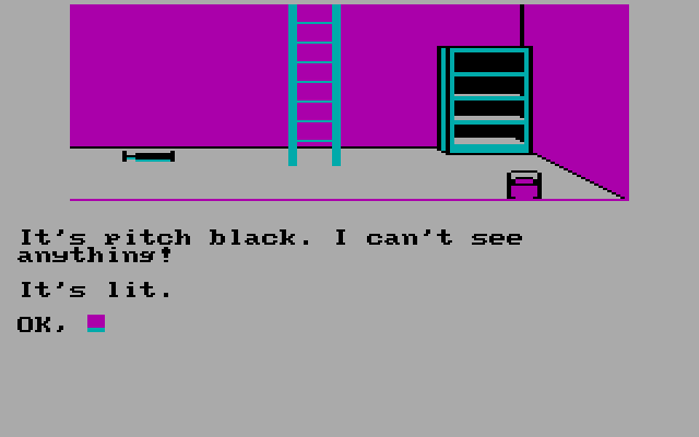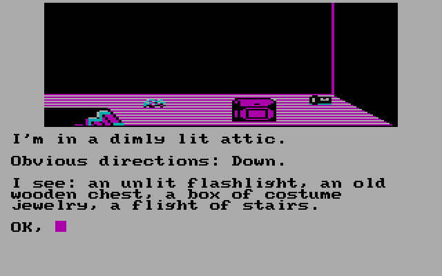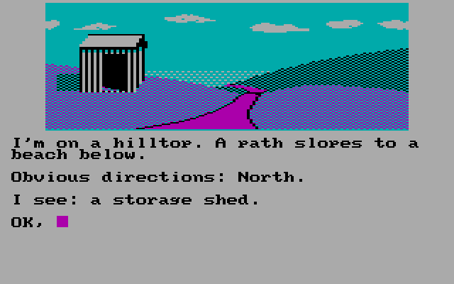 Команды здесь, к счастью, не слишком сложны: WEST (запад), NORTH (север), EAST (восток), SOUTH (юг), UP (вверх), DOWN (вниз), которые можно сокращать до N, S, E, W, U, D. Ещё есть GO (идти куда-либо), CLIMB (поднять предмет), ENTER (войти, ввести) — касательно предмета или помещения, DIG (копать), GET или TAKE (то и другое — брать, можно применять ко всем предметам на экране — TAKE ALL) предмет, PUT или DROP (то и другое — положить), OPEN (открыть) / CLOSE (закрыть) что-либо, LOCK (запереть) / UNLOCK (отпереть) что-либо, SWAP / TRADE (предлагать предмет или торговать), READ (читать что-либо), CUT (вытащить предмет), USE (использовать предмет), ON (включить) / OFF (выключить) предмет, LIGHT (зажечь) / UNLIGHT (потушить) предмет, LOOK / EXAMINE (осмотреть, изучить) — можно просто или применительно к предмету, PUSH (толкать) / PULL (тянуть) предмет, INFLATE (накачать) / DEFLATE (спустить) предмет, LIFT (поднимать предмет), GIVE (брать предмет), TALK (говорить персонажу), SCORE (количество очков), INVENTORY (проверка инвентаря). Надеюсь, ничего не упустил. Замечу, что некоторые команды будут представлены в виде специальных подсказок в документах, на табличках, в ответах персонажей, с которыми мы общаемся. Хотя команды я написал заглавными буквами, парсер не зависит от регистра, то есть можно писать любыми. Головоломки я бы оценил, пожалуй, как средней сложности.