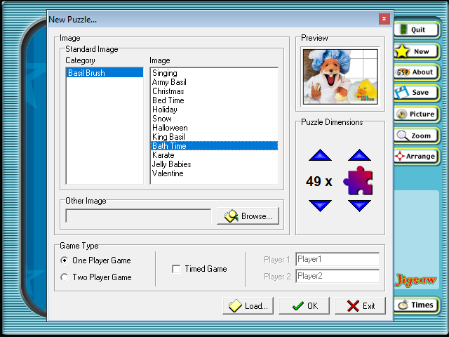 2. Сборник пазлов. Главной его особенностью является наличие соревновательного режима для двоих игроков - каждый по очереди собирает одну и ту же картинку, а выигрывает тот, кто справился быстрее. Форма кусочков может быть стандартной или же квадратной, количество, а вместе с ним и сложность также можно регулировать.