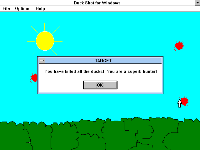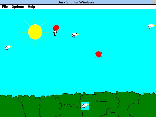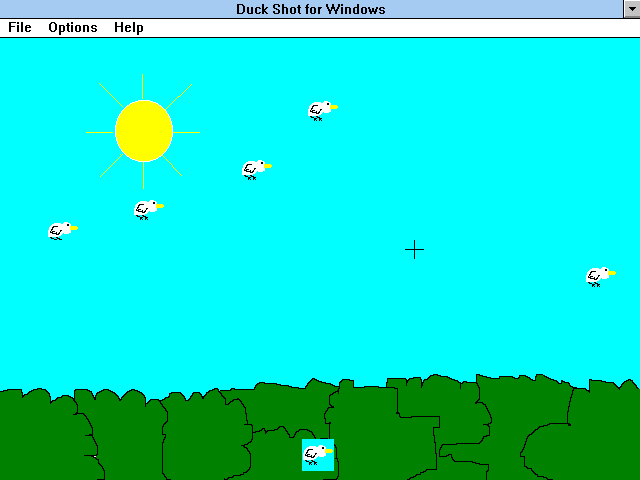 Примитивнейший виртуальный тир на тему стрельбы по уткам. Игра содержит всего один экран, намалёванный за пару минут в какой-то программе, - небо, деревья, солнышко. По экрану летают (а точнее, дискретно перемещаются) семь уток, надо их ликвидировать без каких-либо ограничений вроде таймера, конечных патронов и т.д. Когда дело сделано, видим поздравление; на этом всё. Присутствуют четыре уровня сложности - разница только в скорости безутешных утиных метаний по экрану. Сделана игра настолько небрежно, что когда птица находится на фоне деревьев, вокруг неё виден квадратик цвета неба. Думаю, в сумме это всё тянет только на один балл.