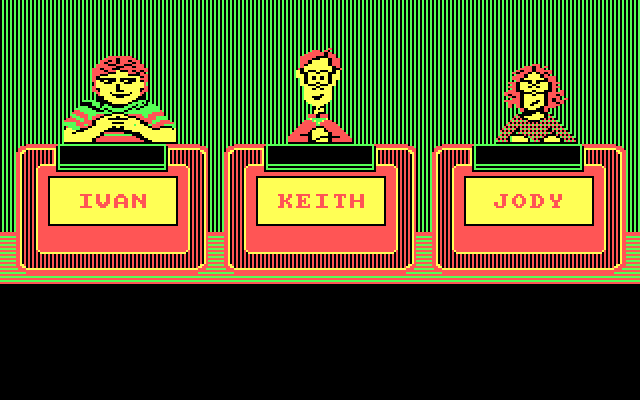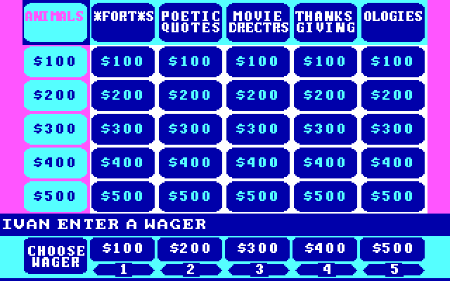 Второе издание Jeopardy! (1987, DOS) от североамериканской компании ShareData - и отнюдь не последнее. Каких-либо изменений ни в графике, ни в геймплее нет, - это ровно та же самая игра, только с другим банком вопросов. "Политические партии", "человеческое тело", "Библия", "писатели Нью-Йорка", "животные" и многие другие темы ждут вас!