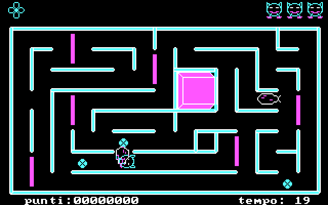 Впрочем, представленный на данной страничке экспонат очевидно является полностью самобытным, хотя, к сожалению, год его появления на свет можно указать лишь весьма приблизительно, а имя автора и вовсе не поддаётся определению. Вероятно, им являлся кто-то из сотрудников редакции того журнала, а то и просто рядовой читатель, который пожелал остаться неизвестным. Во всяком случае, нас ожидают предельно скромная CGA-графика в наименее примечательной серо-бирюзовой палитре и столь же скудные гудки PC Speaker’а в качестве звукового сопровождения. Таковое, кстати, при желании можно отключить на стартовом экране: для перемещения между настройками здесь используются левая и правая курсорные стрелки, а для смены или активации вариантов – «ввод»; помимо выключения звука, дозволяется отрегулировать скорость действа, выйти в систему или начать игру (все надписи даны на итальянском, но смысл их вполне понятен и без особых познаний в области языка Данте).