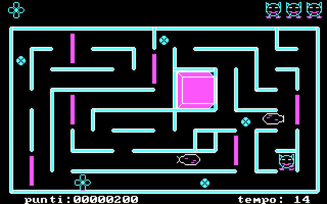 Никаких точек для сбора на поле не имеется, зато периодически в случайных местах лабиринта появляются кружки с крестиками – это бутоны. В которые необходимо выстрелить (!), повернув котика вперёд ногами в соответствующем направлении и нажав «пробел», – после этого поражённая почка распустится, превратившись в цветочек о четырёх лепестках: лишь затем её будет дозволено подобрать. В верхнем левом углу экрана можно отслеживать количество таких объектов, необходимых для завершения уровня: по виду это те же самые цветки, но на деле каждый из них символизирует – по числу своих лепестков – сразу четыре нужные для взятия сущности. Так что на первом из уровней собрать следует четыре распустившихся бутона, на втором – восемь, на третьем – двенадцать, а на четвёртом – шестнадцать (похоже, максимально возможный показатель – тридцать два).