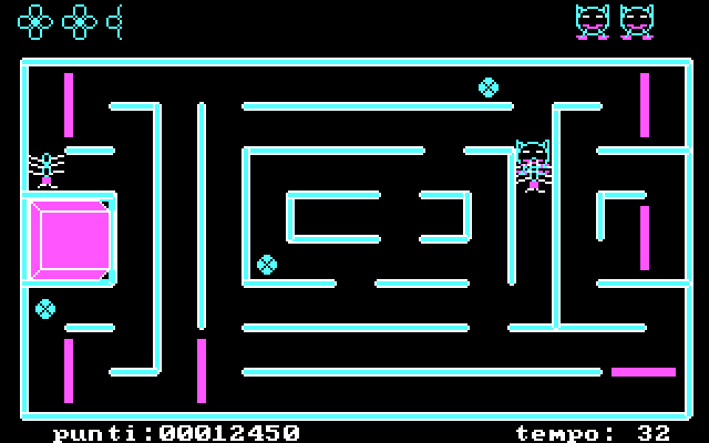 Зато по части игрового процесса всё оказывается очень даже интересным: перед нами – подобие «Pac-Man», но с целым рядом оригинальных, а то и уникальных особенностей. Протагонист, перемещающийся по лабиринту (и управляемый нами посредством всё тех же стрелок клавиатуры), напоминает стилизованного котика и выглядит как круглая голова с острыми ушками на маленьких ножках; враги представлены вынесенными в заголовок насекомыми. На первом уровне это какие-то пятнистые жуки (вероятно, божьи коровки – только скорее продолговатой, нежели округлой формы), на втором – пауки (тоже условные, ибо конечностей у них всего лишь по шесть), на третьем – столь же схематичные (в силу очевидных ограничений по визуальной части) муравьи (а может, гусеницы или сороконожки), а на четвёртом – пчёлы. После успешного прохождения последнего упомянутого уровня всё повторяется по новому кругу, но – уже с более шустрыми антагонистами.