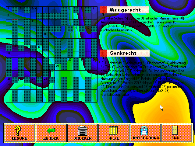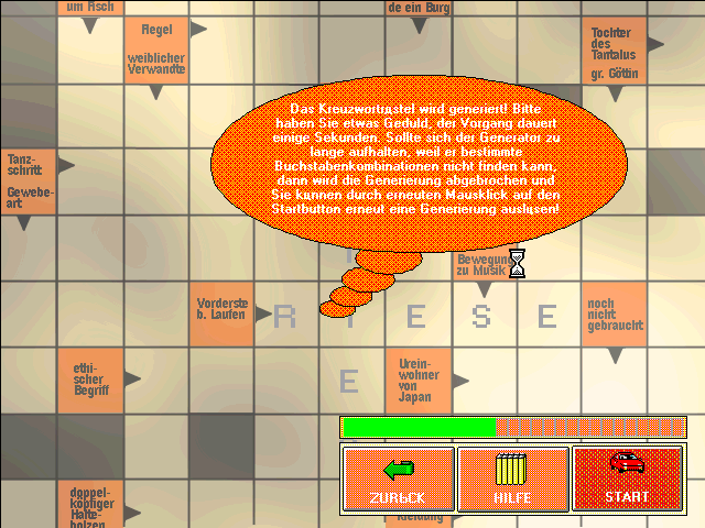 Несмотря на то что на титульном экране игры почему-то изображён сканворд, на самом деле предлагается решать только кроссворды, то есть классический вариант, в котором вопросы не вписаны в свободные клеточки, а идут отдельными двумя списками "по горизонтали" и "по вертикали". Программа предельно бюджетная, и к ряду моментов можно предъявить серьёзные претензии. Так, тут вообще нет никаких настроек сложности, регуляции количества слов и так далее - просто нажимаем на кнопку "Start" с изображением красного автомобиля, начинается генерация кроссворда, после чего можно приступать к решению, нажимая мышкой на слова из сетки и вводя ответы с клавиатуры. Однако этот единственный режим весьма странный. Все варианты используют ровно один макет сетки, которая по факту состоит из четырёх независимых кроссвордов, не имеющих пересечений (!), а в рамках каждой из них все слова имеют не более двух общих с другими клеток, а чаще всего только одну. Наконец, из 29 слов только 8 пишутся горизонтально. Что касается сложности самих вопросов, то она довольно низкая, однако без знания немецкого языка запускать программу не имеет смысла. Единственное, что тут можно настроить, - это фон из трёх предложенных на выбор однотонных текстур. Пожалуй, ещё стоит отметить наличие двух кнопок: одна показывает все ответы, а другая вызывает печать кроссворда, который потом можно будет решать на бумаге.
