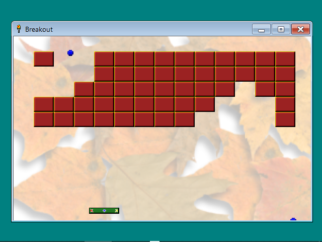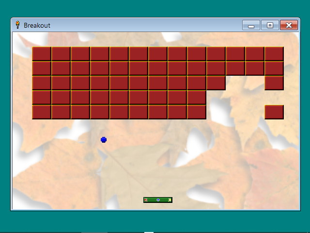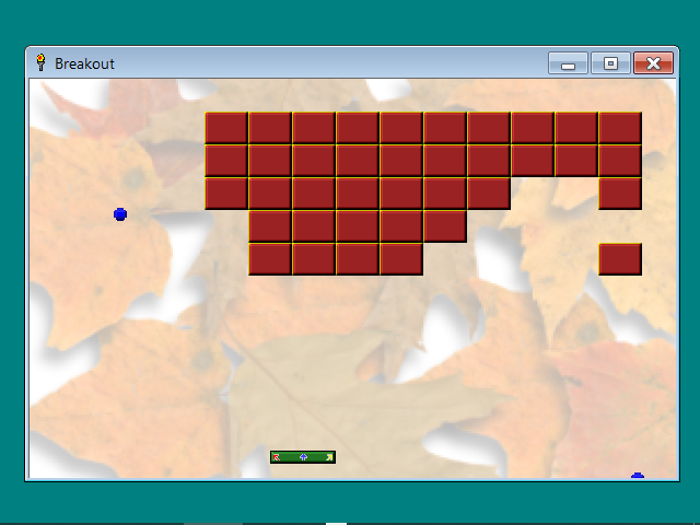 Перед нами оказался образчик примитивнейшего арканоида. Имеется только минимально необходимый набор для такого типа игр: каретка, шарик и некоторое количество кирпичей. Никаких бонусов не предусмотрено. Первый уровень начинается на фоне опавших осенних листьев; если удастся его пройти — а это несложно, если приноровиться, — то в награду получим фон космического пространства с большой концентрацией расположенных на оном космических тел. Имеются три попытки, после траты которых получаем окошко с количеством набранных очков — по 10 за каждый сбитый кирпич. Стоит ещё заметить, что иногда шарик, попадая в зазор между кирпичами, может попросту пролетать их наискосок.