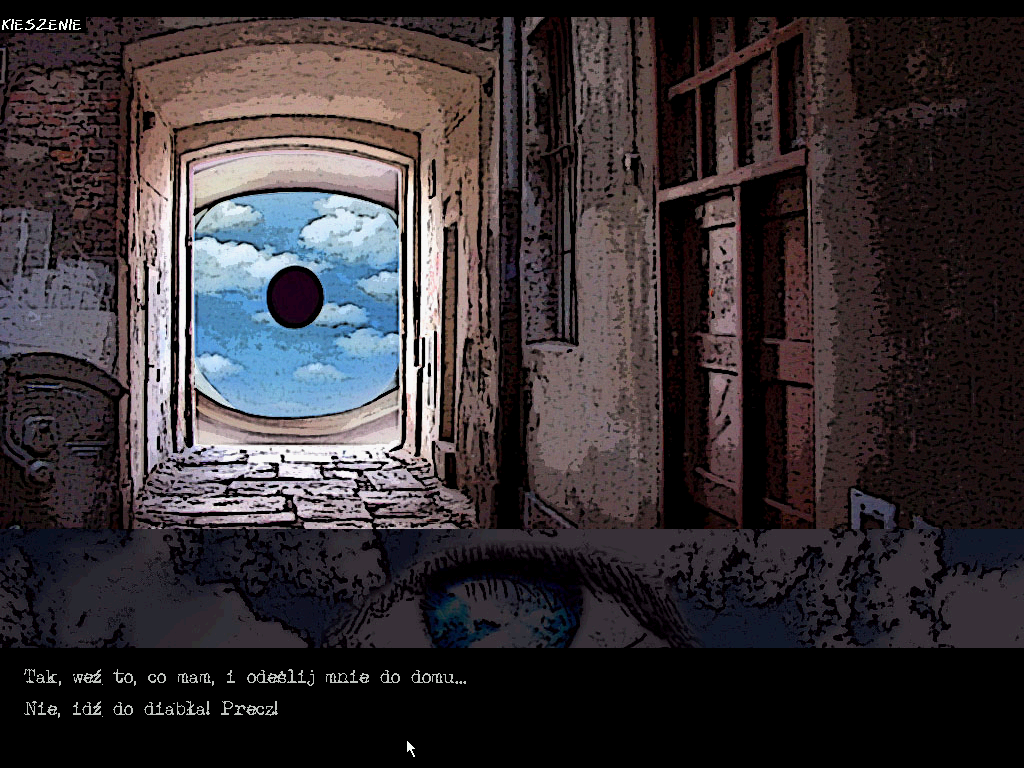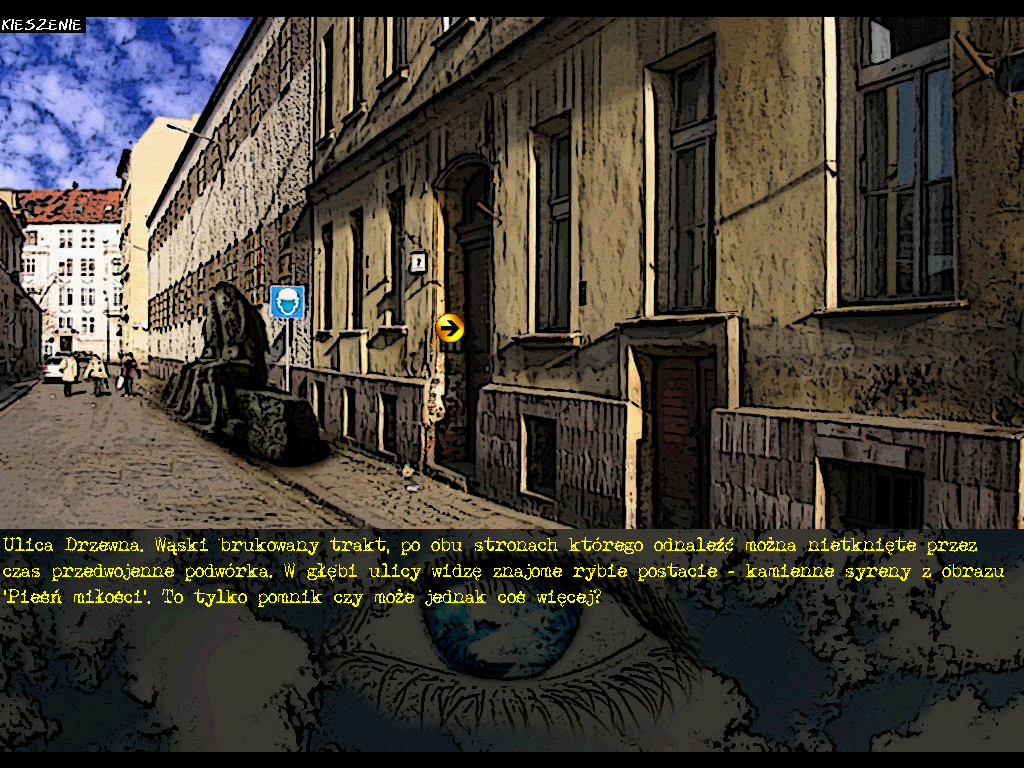 Управление реализовано посредством мыши. Как то и принято в подобном поджанре, все экраны представляют собой статичные картинки-слайды, – анимации практически нет, если не считать редких последовательностей кадров с каким-нибудь условно движущимся предметом или существом, неторопливо сменяющих друг друга. Примерно треть пространства в самом низу занимает панель, отведённая под текстовые сообщения (описания локаций, мысли героя, реплики встречных персонажей и др.); основное же окно выше представляет собой фотоиллюстрации, на которых тут и сям попадаются активные точки, при наведении на них превращающие стандартный и неактивный системный курсор в куда более стильный оранжевый кружок с обозначением того или иного из доступных действий. Которые выполняются нажатием левой кнопки: стрелки позволяют перейти на следующий экран в соответствующем направлении, знак вопроса помогает начать беседу со встречным персонажем или существом (с выбором тем для разговора, перечень которых появляется на нижней панели), символ лупы увеличивает тот или иной фрагмент (для возврата назад можно будет использовать либо стрелки, либо крестик), ну а «галочка» отвечает за взятие предмета в инвентарь. Последний по умолчанию скрыт и обнаруживается в верхней части экрана при наведении курсора на надпись «KIESZENIE» в верхнем же левом углу; комбинировать предметы движок не позволяет, а для использования на основном окне их следует зажимать левой кнопкой мыши и перемещать на подходящее место. Для выхода в систему предусмотрена клавиша «ESC».