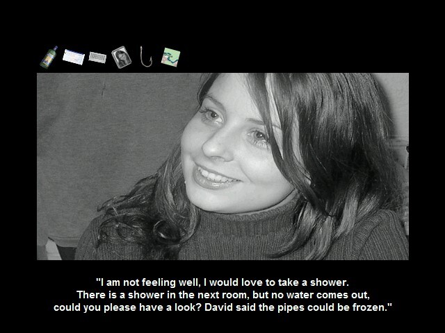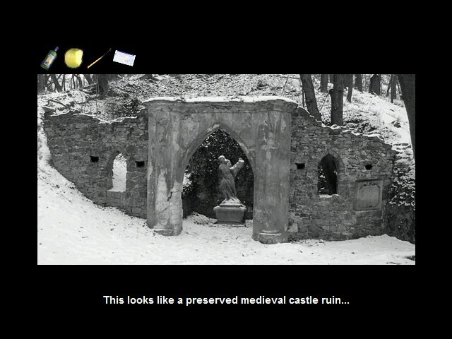 Зато примечательно, что события разворачиваются зимой, а в качестве визуального ряда выбраны исключительно чёрно-белые иллюстрации – что, как видно, вообще характерно для чешского любительского игростроения (вспомним «Přítmí: Twilight»). Здесь же это обусловлено ещё и антуражем, предполагающим – как можно видеть по подзаголовку – обращение к жанру «ужастиков»; кстати говоря, единственным исключением из правил оказывается та самая упоминавшаяся выше бутылка, которая одна только и изображена тут в полном цвете. Перед запуском игра предлагает нам на выбор – помимо предпочтения одного из двух поддерживаемых языков и опционального отключения звука (музыкальное оформление, кстати сказать, вполне приемлемое, а прочих эффектов или озвучки планом не предусмотрено) – ещё и три варианта разрешения, от 640×480 до 1024×768 включительно. Однако основное окно с той самой фотореалистичной иллюстрацией в любом случае отображается в не самом крупном формате 535 на 270 пикселей, – хотя следует признать, что выглядит всё очень даже стильно и чётко.
