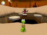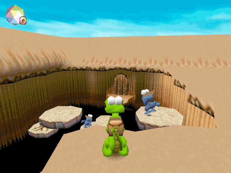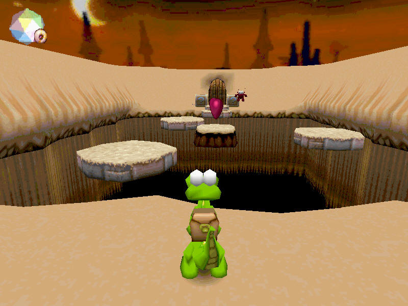 Как уже упоминалось, мир Croc состоит из островов, разделённых, в свою очередь, на множество небольших уровней, каждый из которых нам придётся одолеть в порядке строгой очерёдности. Окружающая нас обстановка меняется с каждым островом, и к замку барона Данте крокодильчику предстоит пробираться через тропические джунгли, холодные, заснеженные горы и коварные пески пустыни. Причём, естественно, нужно не просто идти вперёд, обходя препятствия и ловушки, но ещё и внимательно оглядываться по сторонам, отыскивая и освобождая из клеток и тяжёлых заколоченных ящиков наших друзей-гоббосов. На первый взгляд всё кажется довольно простым, особенно если учитывать «мультяшную», явно ориентированную на детей графику. Однако это ощущение быстро проходит, и вы весьма скоро обнаружите, что вот уже в который раз безуспешно пытаетесь перепрыгнуть очередную пропасть или избежать быстрых ударов обманчиво милых противников. Ловушки, подстерегающие на пути, нередко будут заставлять вас начинать уровень заново. Далеко не сразу можно сообразить, как быстро проплыть между угрожающими электрическими барьерами, запрыгнуть на убегающий от вас ящик, непрерывно скользя при этом по ледяной площадке над бездонной пропастью, или перескочить с одного выступа на другой по едва ли не мгновенно уходящим из-под лап платформам. И сложность таких препятствий – ещё полбеды. Не меньшие, а порой и большие неудобства доставляют многочисленные прислужники Данте, непохожие друг на друга по внешнему виду, но абсолютно одинаковые «по содержанию»: ведь их цель – остановить вас любой ценой, и они с удовольствием попытаются это сделать. Крылатые, хвостатые, зубастые, чертенята, летучие мыши, глубоководные крабы, с оружием или без - все они радостно накинутся на Croc’a, едва завидев его пробегающим мимо. И ладно от них можно было бы избавиться, но нет – даже получив от нашего героя мощный удар хвостом, бестии исчезают лишь на некоторое время. Очевидно, тут сам барон со своей магией постарался...