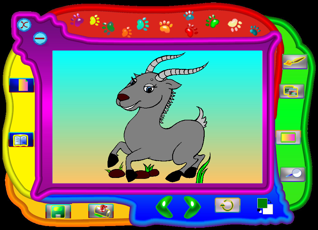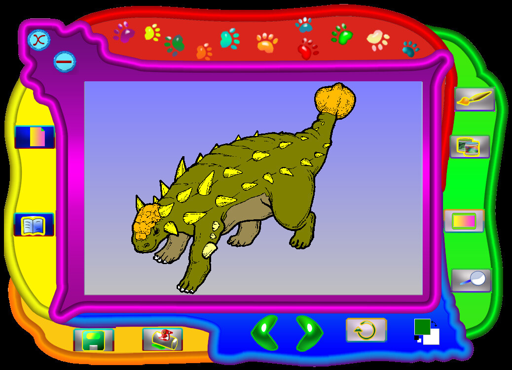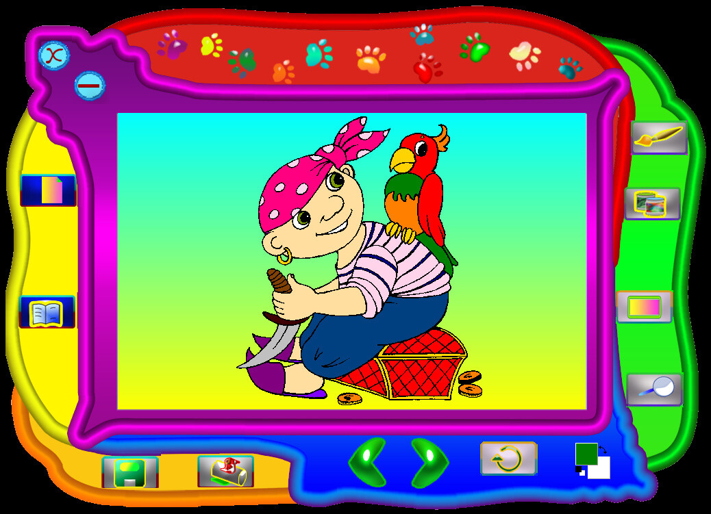 Сама программа открывается в большом фигурном окне, а активация режима раскраски вызывает появление ещё двух окон - маленькое с образцом (можно пользоваться, если хотите раскрашивать по авторскому варианту) и побольше - с палитрой красок. Инструмента два - заливка и кисть; последнюю можно гибко настраивать как в диаметре, так и в "растягивании и сужении", делая из круга овал и обратно. В любом случае получается довольно скудно. Диск посвящён исключительно раскрашиванию, так что можно было добавить и более неординарные функции, если уж это коммерческое издание. Результат творческого сеанса можно не только сохранить, чтобы вернуться к нему позднее, но и распечатать.