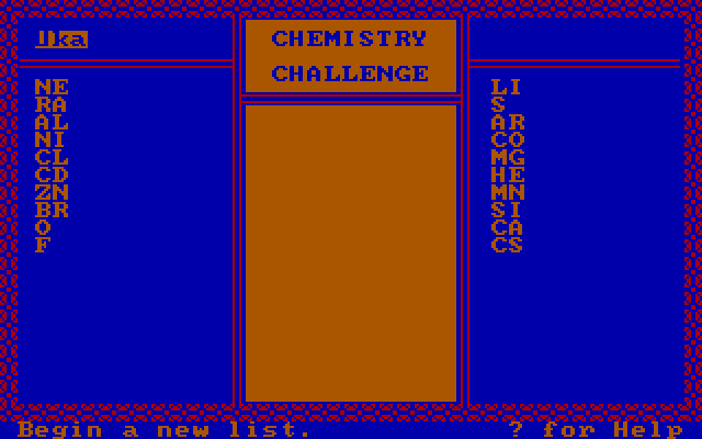 В «химическом» разделе насчитываются три темы, также выбираемые перед началом собственно игры: «Периодическая таблица», «Точки плавления» и «Плотность». Все термины оказываются наименованиями тех или иных элементов или веществ – в первом случае таковые даны в виде сокращений («NE», «ZN», «BR» и т. д.), а в двух оставшихся прописаны полностью («Silicon», «Potassium», «Neon», «Gold» и др.). Соответственно, необходимо расположить их в порядке возрастания атомных весов, температуры перехода из твёрдого состояния в жидкое или показателя плотности. Желающим испытать свои познания в области всемирной истории также предлагаются три тематических раздела: «Изобретения», «Люди и события» и (недолго думая) «Больше людей и событий». В любом случае пользователям (иногда и в соперничестве с компьютерным оппонентом) предстоит расставлять в хронологическом порядке «Радио» и «Азбуку Морзе», «Витамин B1» и «Газонокосилку», «Фашистов», «Большевиков» и «Иран – контрас», «Кублай-хана» и «Маймонида», «Бастилию» и «Второй ледниковый период» – ну и так далее.