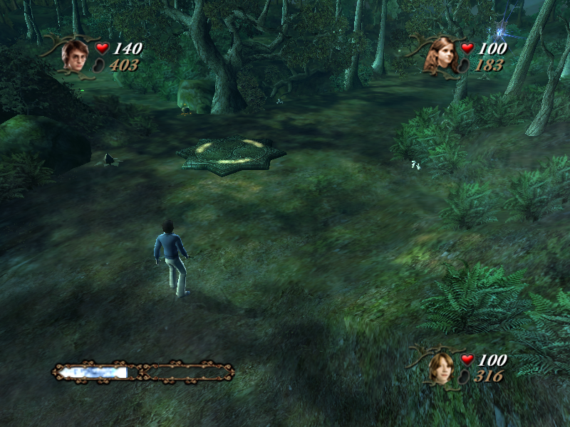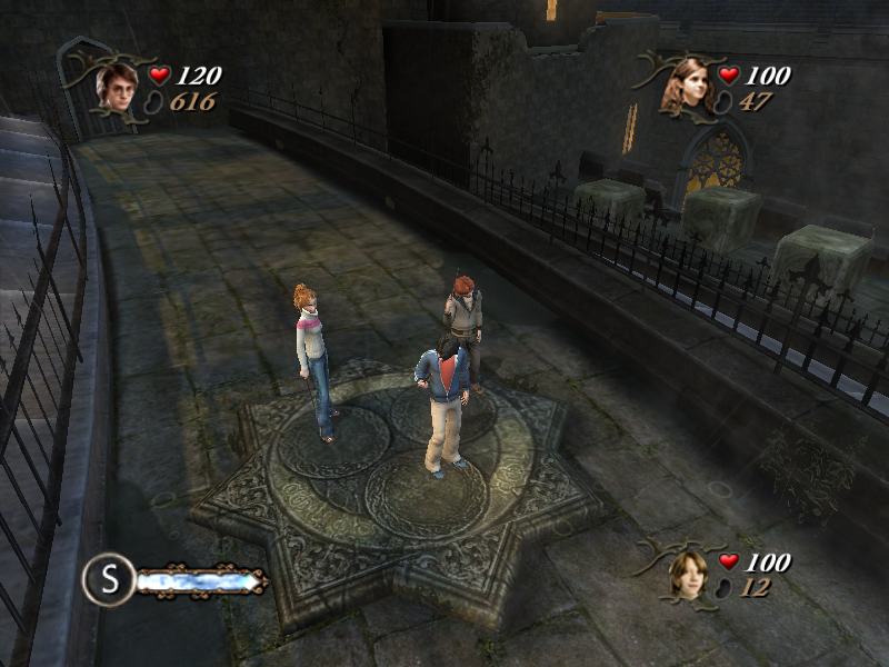 Так как мышь не задействуется даже в меню, то игрок теперь может сам (хоть и несколько опосредованно) выбирать заклинание. Некоторые старые знакомые навроде «люмоса», «спонджифая» или «алахаморы» исчезли. На их место пришли другие – но все сплошь боевые. Под всю магию выделены ровно три кнопки. Разберём их вкратце. Z – «акцио», заклинание притягивания предметов. Оно работает только на волшебные бобы, еду и малые щиты. X – атакующая магия. C – вспомогательная. К последней относятся сменившее свою суть «карпе ретрактум», левитационная «вингардиум левиоса», а также разучиваемые в ходе игры «хербивикус» для роста растений и «аква эрукто» для тушения пожаров. Как правило, в большинстве случаев достаточно быстро жать X, чтобы выиграть в бою. А так как мы с напарниками, то заклинания можно и даже нужно совмещать. Например, условный Рон поднимает врага в воздух, а Гарри и Гермиона закидывают противника светящимися шариками. А иногда встречаются препятствия, которые силой одного волшебника не преодолеть, – например, тяжёлые каменные блоки или поднятые мосты.