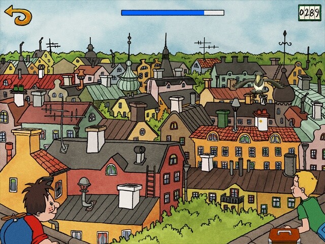Осталось упомянуть ещё несколько «воздушных» мини-игр – те самые, для запуска которых следует нажать в домике Карлсона на дверь справа, чтобы отправиться в полёт над Вазастаном безо всяких «приторных порошков» (конечно, в качестве альтернативного способа их дозволяется просто вызвать с карты из тумбочки, но так оно оказывается несколько менее интересно). Ибо сам этот полёт представляет собой целое отдельное развлечение, в ходе которого можно отыскать среди прочих «активных точек» и свой собственный дом, и песочницу во дворе, где живут Кристер и Гунилла, и ряд других достопримечательностей Стокгольма.