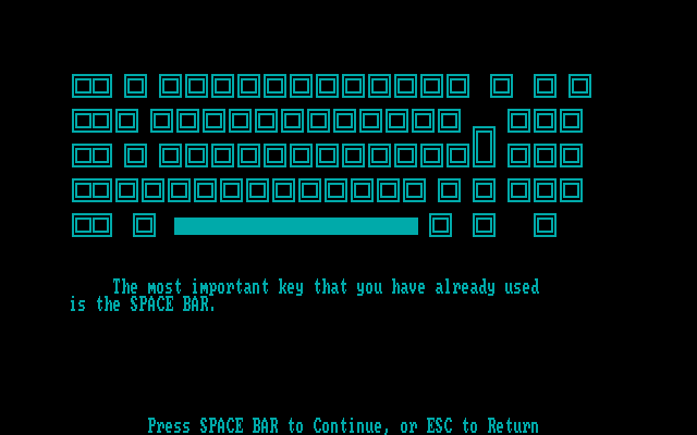 Так, в главном меню оперировать следует «пробелом» и «Backspace» для перемещения соответственно вниз и вверх по списку – и «вводом» для выбора. Первым по счёту (а точнее, «нулевым», ибо именно с этой цифры почему-то стартует нумерация) идёт выход в систему, да и второй пункт, информация о программе, автоматически выводится сразу же после запуска. Так что на момент встречи с этим самым меню выделенным в нём оказывается уже третий раздел, «Как пользоваться компьютером», – да и он является скорее опциональным, ибо предназначался явно для студентов с факультета антропологии, никогда никаких микроЭВМ в глаза не видевших. Следующими по списку идут вопросы тестирования, однако туда нам заглядывать ещё рано. Следует также заметить, что последний (за номером восемь) пункт, «Помощь», также насчитывает несколько подразделов, однако обращаться к ним дозволяется в том числе и из прочих местных режимов в качестве контекстной справки.