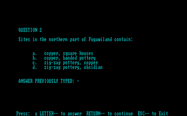 Вынесенный в заголовок «Фугавиленд» – это вымышленный район на севере штата Висконсин, у западного побережья озера Мичиган, где 5000 лет назад обитало некое племя охотников и собирателей. О котором нам и нужно узнать как можно больше на материалах раскопок: что составляло базу жизнеобеспечения представителей культуры Фугави, какого характера были их поселения, сколько человек там обитало – и так далее. С учётом происхождения и назначения «Fugawiland» ожидать от неё изысканной внешности не стоит: игра поддерживает исключительно видеоадаптер CGA и предлагает нам в первую очередь тексты (зато временами разноцветные и на столь же вариативных фонах), тогда как немногочисленные иллюстрации оказываются предельно схематичными. Звуковых эффектов или музыки здесь не замечено; управление реализовано посредством клавиатуры.