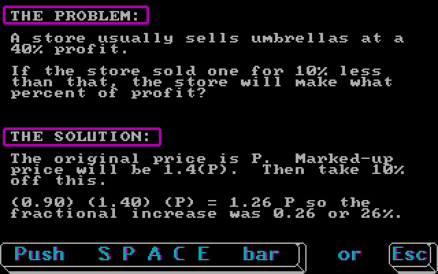 Среди представленных в программе категорий – дроби и проценты, подсчёт площади и периметра, алгебраические уравнения с неизвестными, ряды и целые числа и др. Формулировки задачек варьируются от простейших («Что составляет 1,3% от 0,26?» – с вариантами «0,0038», «0,200», «0,00500», «0,338» и «0,500») до куда более литературных («Алхимик готовил раствор, в котором должно было содержаться 35 мг препарата. Если в результате он использовал 36,4 мг, какова его погрешность в процентном отношении (с округлением до 0,01%)?»). При желании всегда можно запросить подсказку (уровня «Переведите процент в десятичное число, а потом умножьте»); впрочем, после первой же ошибки всё равно покажут правильный ответ, а по окончании всего раунда, сразу следом за статистикой успеваемости, – ещё и подробное пояснение способа решения тех задачек, которые оказались нам не по зубам.