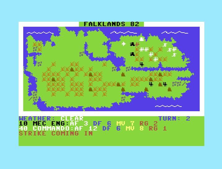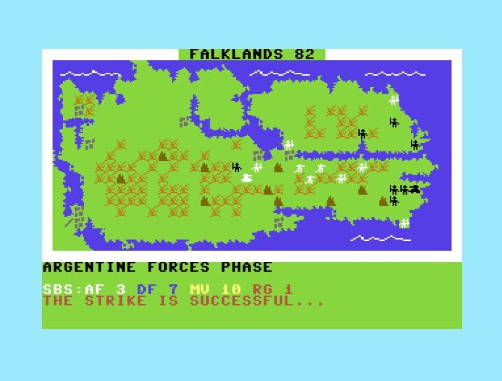 Falklands 82 – пожалуй, самый первый варгейм, посвящённый локальному конфликту 1982 года между Великобританией и Аргентиной за небольшой архипелаг в южной части Атлантического океана. Данная игра представляет собой пошаговую стратегию с очень неплохой графикой (по меркам 1985 года, конечно), которая пусть и условна, но наглядна и как минимум ничуть не уступает в этом качестве более поздним проектам того же жанра, как, например, Overlord: The Invasion 6th June 1944 (1988, ZX Spectrum) или Crete 1941 (1990, ZX Spectrum).