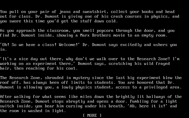 Сюжетная завязка весьма содержательна и занимает целых пять полных экранов игры, дублируемых также и в печатном руководстве пользователя. Наш протагонист – безымянный студент неизвестного высшего учебного заведения, в один прекрасный день отваживающийся посетить лекцию по физике, которую читает профессор с вынесенной в заголовок фамилией. Преподаватель коротает время в пустой аудитории за просмотром кинофильма с участием упомянутых выше братьев Маркс, однако, не без изумления завидев своего первого и единственного слушателя, решает вместо лекции сводить его в лабораторный корпус – и продемонстрировать своё последнее сногсшибательное изобретение.