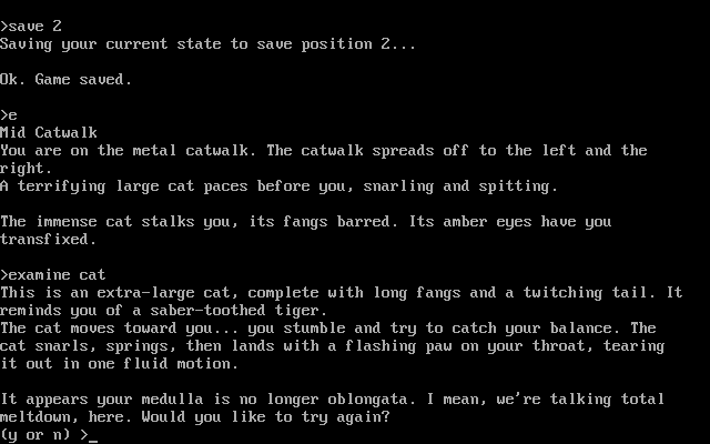 Зато ветераны жанра и знатоки творчества Infocom наверняка почувствуют себя как дома наедине с местным парсером: как используемые сокращения, так и общая манера его общения с нами практически идентичны таковым у игр на движке Z-machine. Направления перемещения (все десять, включая «Up» и «Down») привычно принимаются как в полном их написании, так и в однобуквенном сокращении; для таких часто используемых команд, как ожидание и осмотр текущей локации или содержимого инвентаря, также достаточно ввести литеры соответственно «Z», «L» или «I»; да и многие другие управляющие глаголы и прочие части речи тоже вполне знакомы опытным путешественникам по миру «Zork» («Brief», «Verbose», «Again», «Restart» и т. д.).