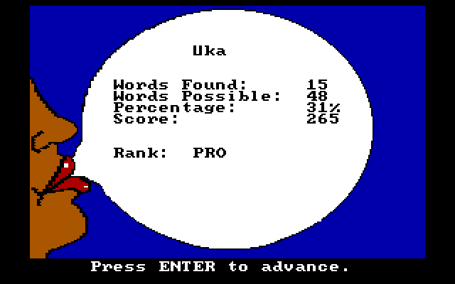 Как уже отмечалось, покинуть мини-игру дозволяется в любой момент, набрав вместо рифмы команду «Quit», – после этого нам продемонстрируют экран статистики: столько-то слов введено из стольких-то возможных, что составляет такой-то процент успешности и принесло в нашу копилку столько-то баллов. В зависимости от итогового результата пользователю присуждают тот или иной «ранг», а набранное количество очков, если таковое оказывается достаточно внушительным, будет запечатлено вместе с нашим именем в местной табличке рекордов.