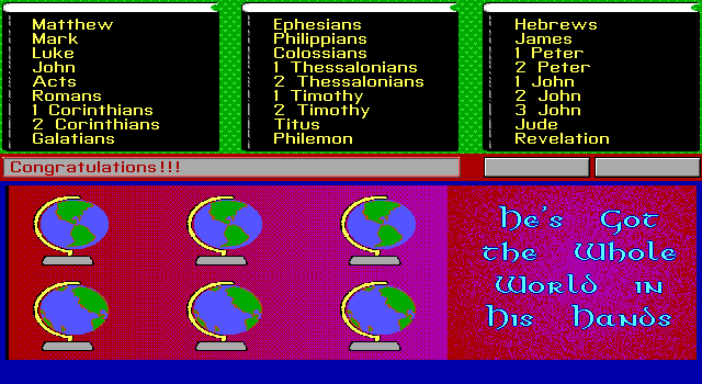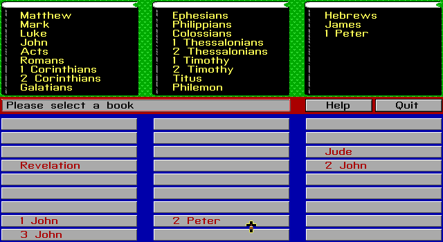 Впрочем, и содержимого тут самый минимум: в нижней части экрана в три колонки перечислены в случайном порядке книги Нового Завета – и нам нужно выставить их согласно строгой очерёдности, щёлкая левой кнопкой мыши (если, конечно, при запуске вы указали именно этот способ управления) и стильным курсором в виде крестика по названиям, после чего таковые выстраиваются уже в столбиках сверху. Ошибки никак не наказываются, однако после двух промахов подряд нам заботливо сообщают правильный ответ (который появляется в строке посередине, левее кнопок «Help» и «Quit» для соответственно вывода краткой справки и выхода в систему). Ну а следом за тем, как все двадцать семь наименований займут свои законные места, мы будем вознаграждены одной из шести местных анимаций (как правило, каким-нибудь мудрым изречением, проявляющимся по центру экрана).