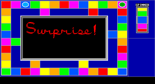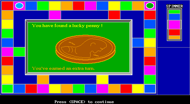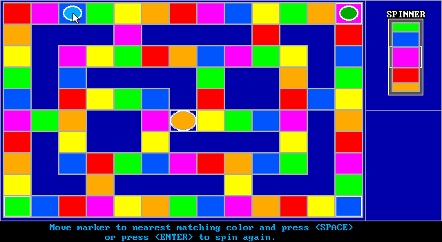 При этом строго заданных направлений движения здесь нет – только общее правило: переходить необходимо на клетку выпавшего цвета, ближайшую к текущей позиции фишки игрока. Перемещение осуществляется движением манипулятора или стрелками клавиатуры, для подтверждения хода следует нажимать «пробел» или правую кнопку мыши, тогда как левая кнопка и «ввод» отвечают за «бросок» (то есть за запуск вертушки). Отправиться на неверную ячейку никто не позволит, однако же и автоматического передвижения сюда не завезли вовсе не случайно: дело в том, что временами сразу две клетки соответствующего цвета могут быть «равноудалёнными» от нашей текущей позиции, а потому и одинаково допустимыми, – так что какой-никакой выбор как минимум изредка да появляется.