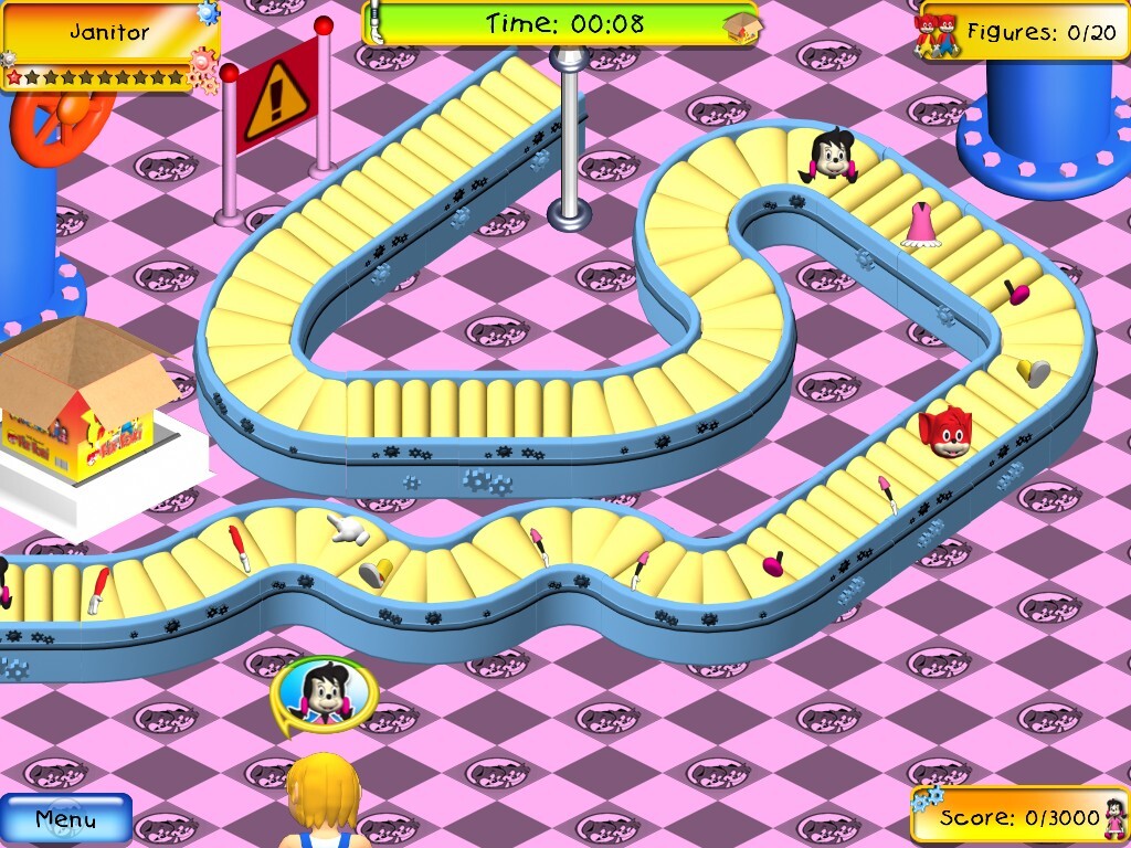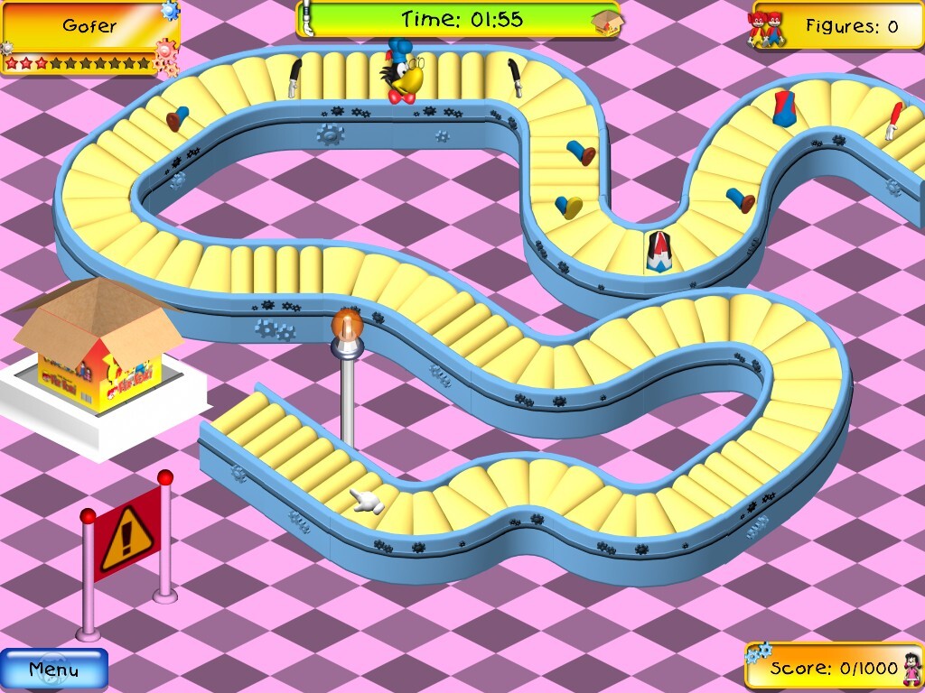 Из элементов интерфейса четыре оказываются более-менее одинаковыми для обоих режимов: в левом нижнем углу красуется кнопка для выхода в меню, в аналогичном месте справа – счётчик очков, набираемых за успешную работу на фабрике (как вы уже заметили по главному меню, табличка рекордов здесь имеется). В самом верху по центру отображается таймер, а в правом углу – индикатор количества собранных нами фигурок: в «выживании» оба этих показателя просто возрастают (ибо задача игрока при этом заключается лишь в том, чтобы продержаться как можно дольше), тогда как в «карьере» на разных уровнях первый может и уменьшаться, а второй – состоять из двух чисел, планового и текущего: дело в том, что в одних случаях от нас здесь могут требовать выпустить то или иное количество готовых игрушек, тогда как в других – не допустить переполнения конвейера в течение стольких-то минут.