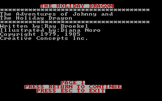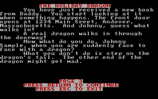 Здесь перед нами предстают четыре практически готовых истории на любой вкус. Посвящённые увлекательным и поучительным приключениям нашего мальчика или нашей девочки – и более-менее учитывающие все только что указанные нами личные характеристики героя. В детективе «The Mystery of Scented Mountain» пользователь выступит в роли юного сыщика, пытающегося вернуть разным существам похищенные у них запахи; «The Holiday Dragon» поведает историю о нашем знакомстве и плодотворном общении с дружелюбным и весёлым драконом; «The Adventures on the Riddle Planet» отличается антуражем уже научной фантастики и расскажет о том, как мы бороздили просторы Вселенной, решая всевозможные хитроумные загадки; ну а в «The Greatest Circus Story Ever Told» мы вернёмся в свой родной город во время гастролей там цирка (причём аккурат в наш день рождения). Пролистывать странички нужно одну за другой нажатием «ввода»: этим и исчерпывается вся интерактивность.
