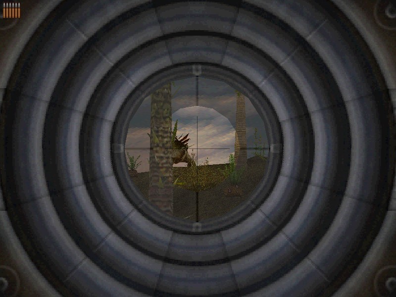 …потому что больше ни одна другая нация не способна развлекаться столь унылым способом. Мне почему-то кажется, что жители США искренне считают бейсбол отличной динамичной игрой, однако, на мой вкус, что он, что Carnivores – понятия одинаковой степени скучности. Итак, товарищ Охотник-на-Динозавров, первое, к чему вы должны привыкнуть, – полное отсутствие любых других форм жизни. Действие происходит на шести охотничьих угодьях, которые представляют собой острова в огромном океане. Надо сказать, что местность населена весьма плотно: в воздухе летают птеродактили, травоядные рапторы щиплют травку, а тираннозавры щиплют травоядных рапторов. В воздухе пахнет охотой и слышится пение птиц. Только вот птиц в игре нет. Нет в ней и рыб. Кроликов. Оленей. Я не говорю, что рядом с тираннозавром должен обитать медведь. Просто очень странно, что кроме десятка динозавров на планете никого и нет. Да, вы не знали? Мы убиваем не абы кого, а «цели миссии». Заранее выбрав свою жертву (и изучив ее слабые места), мы в дальнейшем будем получать очки только за убийство вышеозначенного вида животных. Очки нам нужны для того, чтобы со временем превратиться из новичка в продвинутого охотника, а еще через некоторое время (читай: через пару часов реального времени) - настоящим богом охоты. Что автоматически позволит нам пободаться с сами T-Rex’ом…