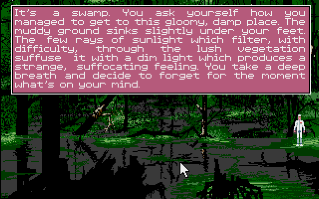 Что касается адвенчурной части, она очень затягивает. Я думаю, что этому способствует небольшие локации, не позволяющие игроку заскучать. Согласитесь, что приятней искать разгадку на 2 экранах, чем часами лазить по 10-20 экранам в поисках пикселей. Нет, не подумайте, я совершенно не против любых видов приключений, будь то больших или малых, но вот именно этому квесту небольшие локации просто идут к лицу – с большими я бы ее наверное даже бросил, не дойдя и до середины.