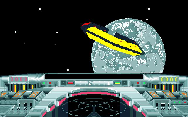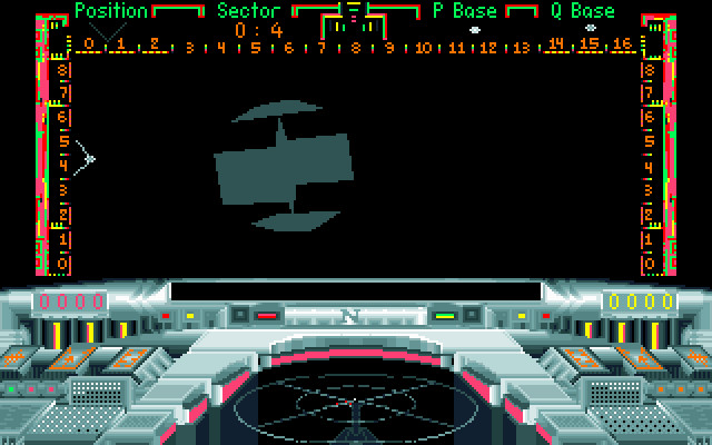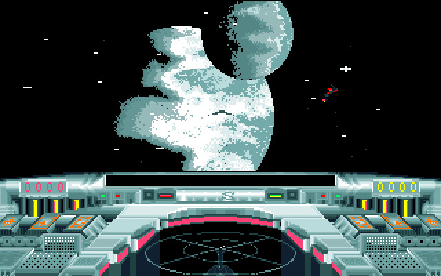 Да, здесь чуть покрасивше графика, чем в самой первой "Элите" - есть поддержка VGA, кабина пилота изменяет цвет если оказывается освещена синим светом от планеты или красным от ближайшего солнца - очень стильный ход, согласитесь. Кораблики такие же малополигонистые и бестекстурные, и, сами понимаете, особого разнообразия при такой технологической ограниченности ждать не приходится. Управление довольно сбивчивое, приборная доска не слишком удобная, в результате часть операций (в особенности боевых) приходится совершать больше по памяти, чем по приборам. Фигово.