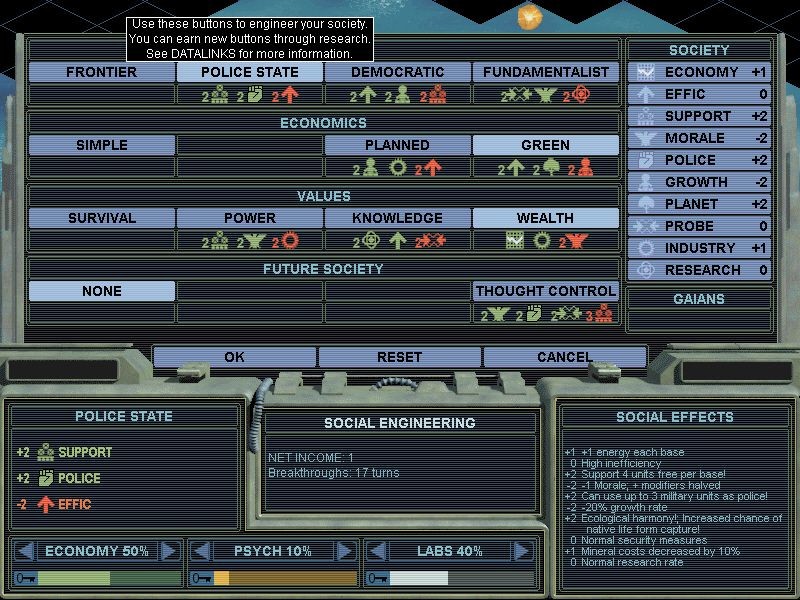 Таким образом, возможны варианты. Вы можете по образцу Спартанцев полковника Сантьяго захватить все континенты на дешевых багги, которые даются в самом начале, или стать небольшим, но технически развитым государством наподобие Университета Планеты. Некоторые предпочтут "зелёную" демократию, как у леди Дейдре, чтобы вместо солдат-людей полагаться на червей-мыслеедов и других аборигенов, с которыми эмпаты наладили связь. Свободный рынок, тотальная диктатура и иные варианты развития тоже доступны. Панель "Социальная инженерия" позволяет выбирать среди форм общественной жизни, ставить общие задачи и ориентиры ради конкретных благ. Так, по мере роста вашей территории и удаления городов от столицы вы будете терять все больше энергокредитов (денежные единицы игры) из-за бюрократии и слишком короткой "вертикали власти". Этого можно избежать, перейдя на более крутую и радикальную форму правления, но у нее найдутся и свои недостатки, а соседи могут принять решение в штыки. Нечто подобное уже было и есть в "Цивилизации", но Alpha Centauri выводит планирование на такой уровень детализации, так тщательно интегрирует его в общую стратегию, что память о глобальном характере решений вас никогда не покидает. Вы не просто строите империю, включая "Тиранию" или "Республику" по обстоятельствам, а задаете общий курс. Каждое движение в Alpha Centauri еще и сюжетно обосновано, поэтому контроль достигает качественно иного уровня. Некоторые открытия, например, нет смысла делать, если вы не хотите победы через Перевоплощение.
