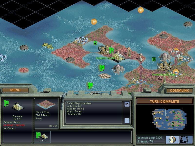 Во-первых, наряду с обычными строениями, которые, к большому сожалению, никак нельзя увидеть (все постройки существуют лишь в качестве надписей на экране города), у вас есть возможность начинать Секретные Проекты. Подобно Чудесам Света "Цивилизации", Проекты могут быть инициированы любой стороной, достигшей нужного уровня развития, строятся единожды и остаются в том городе, в котором были завершены. Если этот город стерт с лица земли, например, ракетой-Планетобоем, то и Проект навсегда утерян. Список вариантов довольно длинный. Например, ранний Проект под названием "Погодная парадигма" на 50% ускоряет работу ваших юнитов-терраформеров, которые способны изменять 3D-ландшафт карты, осушая моря, заболачивая местность, воздвигая горы и так далее. Затем клетки могут быть более выгодно обустроены солнечными зеркалами, скважинами, фермами, аэродромами для дозаправки самолетов и тому подобным. Бонус для таких улучшений в 50%, да еще в начале игры, потенциально означает рывок вперед для партии, первой закончившей "Парадигму". Другой Проект, "Виртуальный Мир", превращает Сетевые терминалы (Network Nodes) всех ваших баз в развлекательные центры и уменьшает количество недовольных в городах, Проект "Алгоритм Найди-Убей" полностью защищает колонии от саботажников и шпионов других партий, и так далее. Постройка любого из Проектов приносит большую выгоду и ощущается как значительное событие.