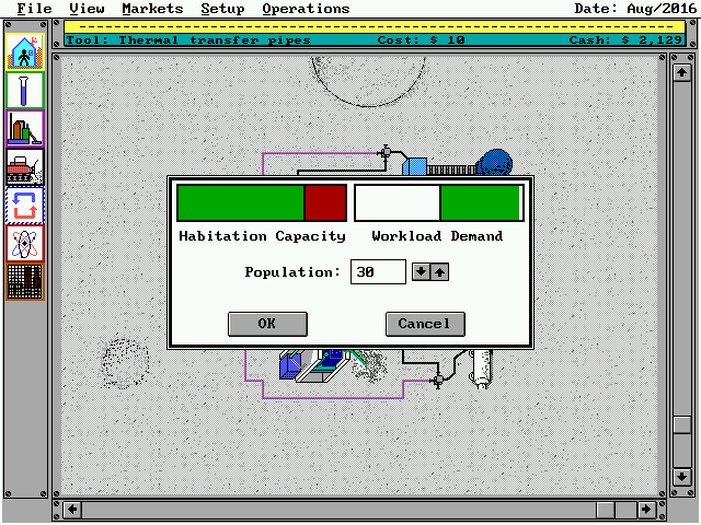 Игра очень детализирована - помимо добычи ресурсов, торговли и поддержки со стороны земных властей, придётся строить много зданий, следить за уровнем содержания кислорода, количеством воды и температурой на территории колонии, а также за много чем ещё... А конечная цель, как я её понял, - добиться полной независимости вашего маленького государства.