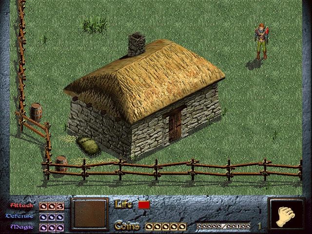 На Диабло и правда не похожа, так как подземелий тут лишь парочка, да и то на несколько экранов, другое управление, дуэли 1 на 1\2\3 с врагами, а не выкос нечисти, зачатки цельного мира, сжигание ёлок™. И ручной подход. Действительно ближе к Lba, чем к Диабло. Сначала я играл магом (ну а кем же ещё), и проблема была вся в том, что магия тут прокачивает лишь скорость каста. И пусть с фаербола я потом строчил как с пулемёта - этого было мало. А другие заклинания не компенсировали утрату. Ради последнего боса (коий есть один из разработчиков игры) мне реально пришлось докачивать пару уровней, чтобы еле-еле его только завалить. А ведь прокачиваешься тут в основном и правда на бутылках, со временем планка опыта крутеет изрядно, так что было "круто" наяривать круги по примыкающему подземелью левел-апа ради. А резервацию с гоблинами сначала проходил вообще с помощью артмани, чтобы узнать, на верном ли я пути (играл по итогу честно). Там просто ещё, если случайно выйдешь за пределы экрана в другой - враги отлечиваются; а иногда тебя, наоборот, запирали, пока не оставался только один. С мечами и луком всё пошло заметно веселее, и вот тут что мне нравилось, так это то, что вещей было мало, но зато каждая давала ощутимый прирост, каждую надо было где-то достать, каждая в итоге чуть личность, даже крит для лука можно было докупить, и денег оно всё стоило. В общем, это "моя игра", я даже в тетрадку выписывал конечные характеристики прохождений. Потом в нулевых в интернете по карточкам находил на офф. сайте лишь парочку модулей (других игровых миров на движке). И стало очень обидно недавно узнать, что модулей оказывается было предостаточно, но на других фанатских ресурсах.