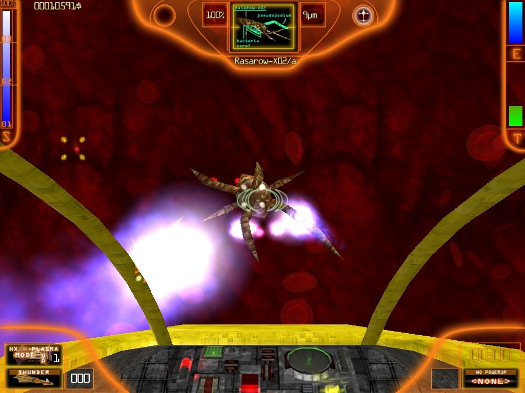 Видов оружия у вас не так много, но всё же несколько различных имеется. И кое-что против кое-кого из врагов применять совсем не годится, а иногда – наоборот, то есть чем-то одним не обойтись. Также следует иметь в виду, что для каждого оружия нужен вполне конкретный боезапас, который отнюдь не бесконечен, и, понятное дело, в организме человека миниатюрные пули и торпеды взять неоткуда. Выход один – «купить». Да, именно купить. Технология тут вот какая. Изначально вам даётся несколько видов оружия (не все) и довольно большой запас боеприпасов. Вы собираете штаммы вирусов и бактерий, которые здесь выполняют роль бонусов, и этим создаёте базу для своего будущего гонорара. Однако любая «помощь вам»: новые пули или торпеды, какое-то новое оружие (например, плазменная пушка) или, скажем, защитная броня для лодки – стоит денег, притом весьма солидных, для приобретения многого придётся на какой-то момент, возможно, даже оказаться на «нулевом» балансе (сумма приобретённого вычитается из суммы «заработанного» на данный момент). Но без апгрейдов игру, увы, не пройти.