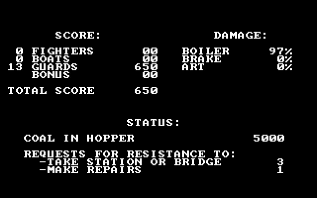Понятно, что на начальном запасе горючего не доехать. Поэтому к вашим услугам железнодорожные станции, на которых необходимо запасаться углём и водой. Именно необходимо, а не «можно», ибо большая их часть находится под контролем немцев. Оружие у вас есть, но гораздо проще просто избегать стычек. А вот где их избежать не удастся – так это на мостах: под ними плавают вражеские лодки, поэтому для возможности проехать надо сначала расстрелять из большой пушки эти лодки. Также есть возможность связи по радио с Сопротивлением – ваши друзья могут вам помочь с захватом какой-нибудь станции, тогда вы без проблем запасётесь там топливом.