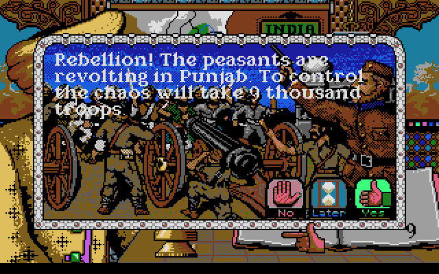 Помимо военных действий, которым в игре уделено довольно значительное внимание, имеется и дипломатия, которая чаще всего сводится к попыткам мирно решить территориальные вопросы – какая область кому будет принадлежать. И вот именно здесь мы переходим к тому моменту, который и выделяет (помимо, понятно, общего антуража) Champion of the Raj из числа других стратегий. Без него это была бы просто пошаговая стратегия про Индию. Но с ним…