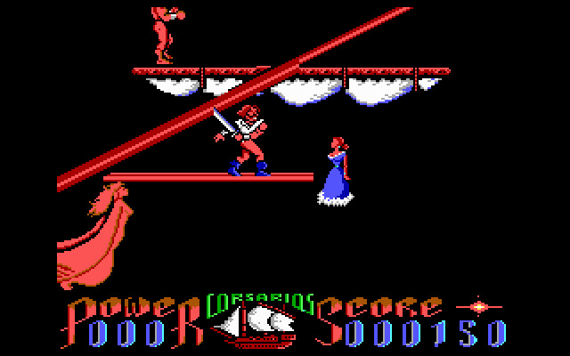 Вторая часть гораздо сложнее и интереснее. Здесь ваш герой оказывается на пиратском корабле, где пираты держат в плену дочь испанского губернатора и хотят скормить её акулам (видимо, потребовать выкуп не догадываются). Вам нужно, пробиваясь через ряды пиратов, за определённое время найти девушку и освободить её. Тут уже всё реалистичнее: у вас появляется сабля, однако жизнь и сила удара уже вполне сопоставимы с аналогичными показателями противников, а время прохождения ограничено. Интересно, что сражаться придётся в основном на мачтах судна, поочерёдно зачищая каждую и срывая пиратский флаг, ибо держат девушку на самой высокой из них.