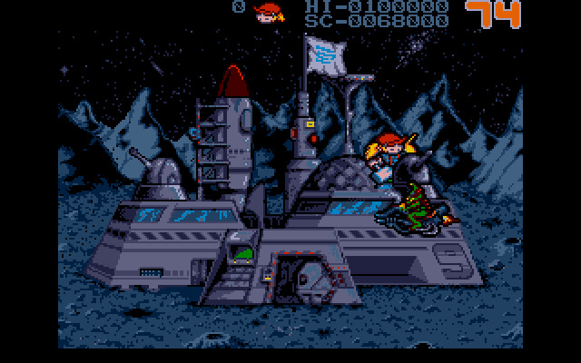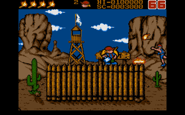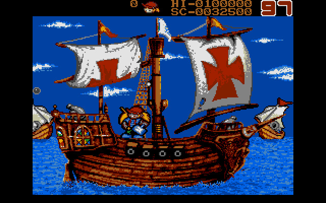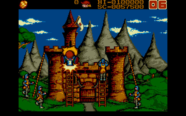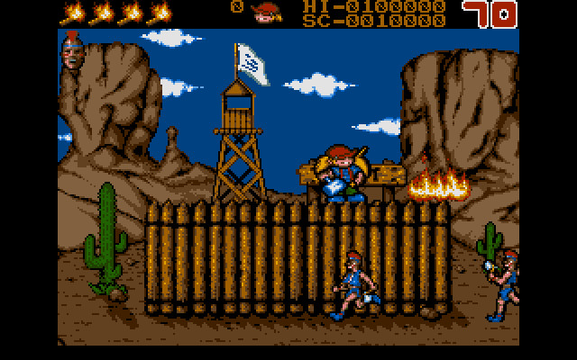 Уровней тут много, каждый представляет собой какую-то историческую эпоху. Например, на первом уровне мы защищаем американский форт в прериях от индейцев, на втором – корабль от пиратов, на третьем – средневековый замок от враждебных рыцарей, на пятом – вообще лунную базу от пришельцев на летающих мотоциклах, но суть везде остаётся одной и той же: враг подбирается/подлетает/подползает к нашему герою и получает «BOOM» по голове молотом. Иногда бывает, что кто-то догадается чем-то бросить или выстрелить в мальчика, и тогда это «что-то» тоже надо постараться отбить молотом. Больше здесь ничего нет. Кстати говоря, графика смотрится вполне красиво.