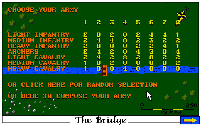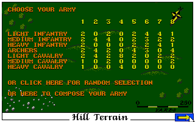Перед сражением можно выбрать один из трёх типов ландшафта и настроить кое-какие параметры армии (общая численность, типы юнитов). Типов этих несколько – два вида пехоты, стрелки, артиллерия. Перед каждым ходом можно отдать тому или иному роду войск определённый приказ. Отдельно стоит выделить возможность «сплотить» войска криком генерала.