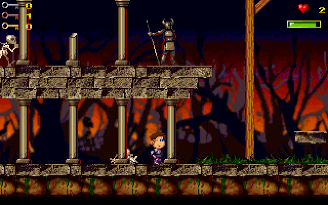 Имеется несколько видов бонусов. Самые важные из них – ключи, висящие в воздухе, которые надо собирать для продвижения по сюжету. Большая часть других бонусов лежит в сундуках, на которые надо также напрыгивать, чтобы открыть. Одни бонусы восстанавливают здоровье, другие временно дают что-то полезное. Например, бонус в виде соски (хм…) на время превращает мальчика в настоящего рыцаря – в доспехах, шлеме, с мечом и щитом, и в таком состоянии он куда сильнее и выносливее. Потом можно будет найти лук (или его подобие), чтобы стрелять по врагам.