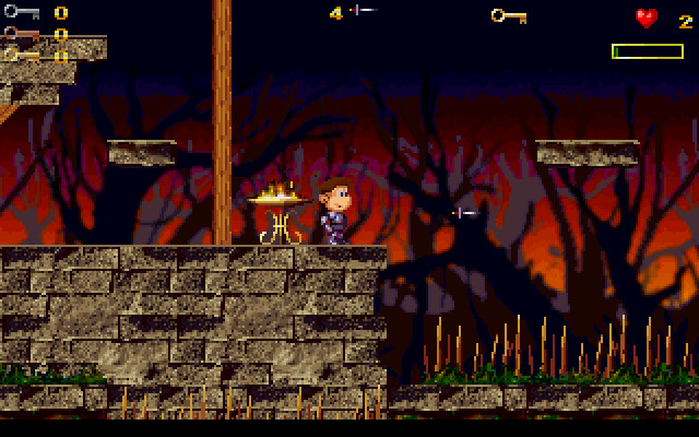 У героя имеется несколько жизней и «полоска» жизни, то есть смерть не происходит от одного удара при контакте с врагом. Тем не менее, мальчик мгновенно погибает, если попадает в воду, на острые шипы и так далее, а таких ситуаций (то есть ловушек и опасных мест) в игре будет масса. Да, играть в это действительно сложно: например, уже на первом уровне предстоит прыгать с высоты на движущееся по воде туда-сюда небольшое бревно; чуть-чуть промахнулся при прыжке – всё, смерть. А дальше будут аналогичные ситуации, только куда более сложные, где одновременно с преодолением препятствий придётся ещё и убивать или уворачиваться от врагов…