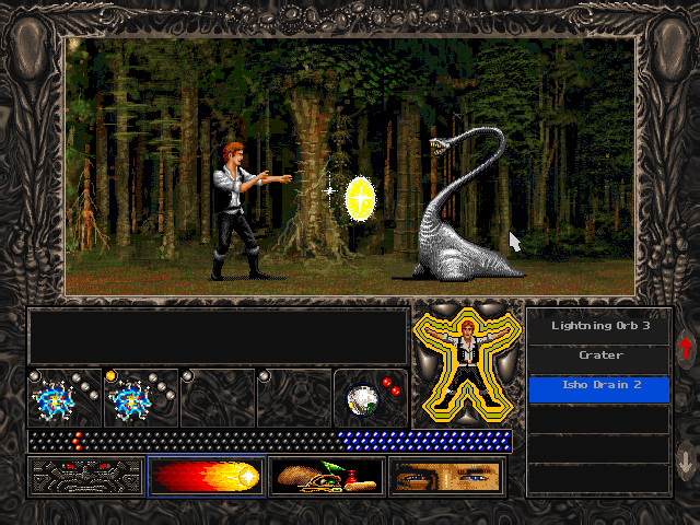 Как я уже говорил, в первый раз новизна и странность этого мира помогают преодолеть занудство простой формулы, но чего хочется на самом деле так это поиграть в реальную, настольную RPG SkyRealms of Jorune. Там гораздо больше рас, чем показано здесь, и у них цивилизации, города, торговля, и тайны планеты тоже куда глубже, разнообразнее и интереснее, потому что ведущему предлагается сочинить эти тайны, и энергия Джоруны годится не только на то, чтобы шариками пулять (хотя во-многом, признаю, все-таки для этого). В Alien Logic, однако, приличные портреты персонажей и очень хорошо отрисованы фоны, особенно природных зон, хотя они и не совпадают часто с местностью на карте. Ходите вы, например, по леднику, а в режиме аркады вокруг лес. Это дссадно. Зато как нарисован этот лес! Он напомнил мне про настоящие хвойные леса, где я бывал когда-то. Вообще игра из времен, когда вокруг еще была природа, хотя и не инопланетная. Дает возможность вспомнить, как это, когда не все застроено и не постоянная жара.