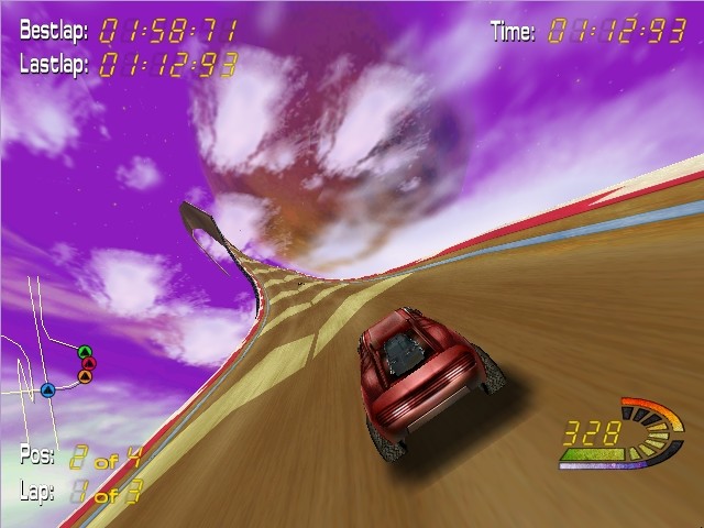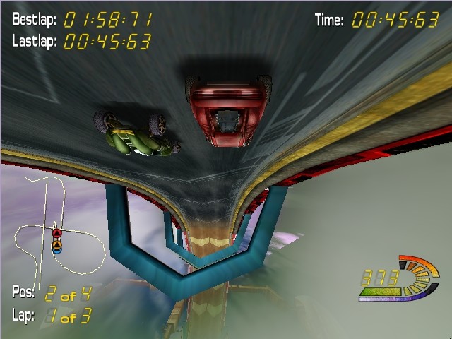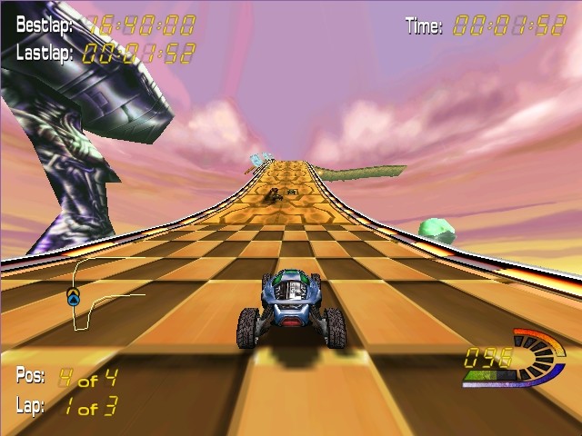 На выбор даны четыре различных машины, различия которых не только во внешнем виде (кстати, выглядят они действительно необычно), но и в характеристиках (скорость, занос и так далее); правда, управление одной мало чем отличается от управления другой. Ни о какой реалистичности управления, физике, системе повреждений и прочем говорить не приходится – здесь ничего этого нет. Машину, наверное, всё же можно разбить, но гораздо проще быть вытолкнутым в пустоту. Да, потому что трассы здесь (всего их, кстати, около двенадцати) очень странные в плане границ: с одной стороны – вроде этих границ толком и не видно, с другой – на деле они очень узкие.