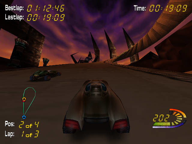 И всё это – в превосходной графике времён расцвета 3dfx, с уймой различных эффектов и такой красивой картинкой (несмотря на статичность фонов), что просто зубы сводит, - ядовитые и не всегда логичные сочетания цветов прекрасно передают атмосферу игры. Да, игра получилась далеко не идеальной, пусть и заслуживает как минимум среднюю оценку (всё-таки очень жаль, что на самих трассах не так много интересного, а машин мало и друг от друга они реально различаются только видом). Но при этом ни в коей мере не заслуживает забвения: даже если как от именно гонки от неё и мало проку (для кого-то), здесь, если уж на то пошло, можно просто полюбоваться изумительными видами трасс. Ну и, конечно, нельзя забывать о том, что вещь эта достаточно редка. Поэтому всем поклонникам красочных футуристических гоночных игр стоит на это взглянуть хотя бы мимолётным взглядом, и кто знает – вдруг он задержится на игре надолго?..