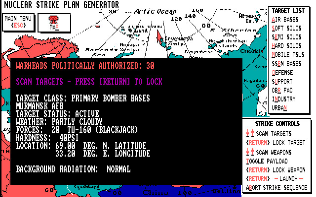 Вы в этой игре – главнокомандующий всеми американскими или советскими ядерными силами (воздушными, над- и подводными), а также можете взаимодействовать с ПВО, дабы предупреждать ядерные удары войск противника. Игровой процесс, естественно, пошаговый, и внимательно планировать предстоит действия в каждом ходе.