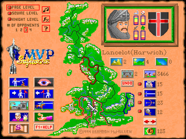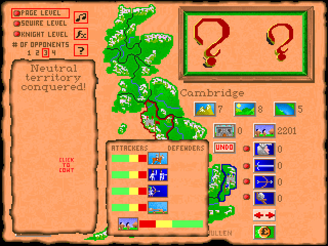 Вам предлагается играть за одного из пятерых бывших рыцарей Круглого Стола (можно выбрать любого, все они вполне реальные, взятые из легенд артуровского цикла), которые, словно бродячие псы, теперь грызутся между собой за каждую пядь многострадальной кельтской земли. Конечная цель – объединить все земли под своей властью (часть территории вам принадлежит изначально, остальная разделена между тремя другими претендентами на наследие Артура [или иным их количеством]). У каждого «псевдогосударства» каждого рыцаря есть столица, отмеченная на карте маленьким замком с флажком его цвета, если этот город захвачен (даже при условии сохранения им других территорий) – его земли автоматически присоединяются к землям присоединившего его. Несмотря на то, что реальное королевство Артура никогда не включало в себя всю территорию даже современной Англии, здесь в качестве игровой доступна карта всего острова Великобритания.
